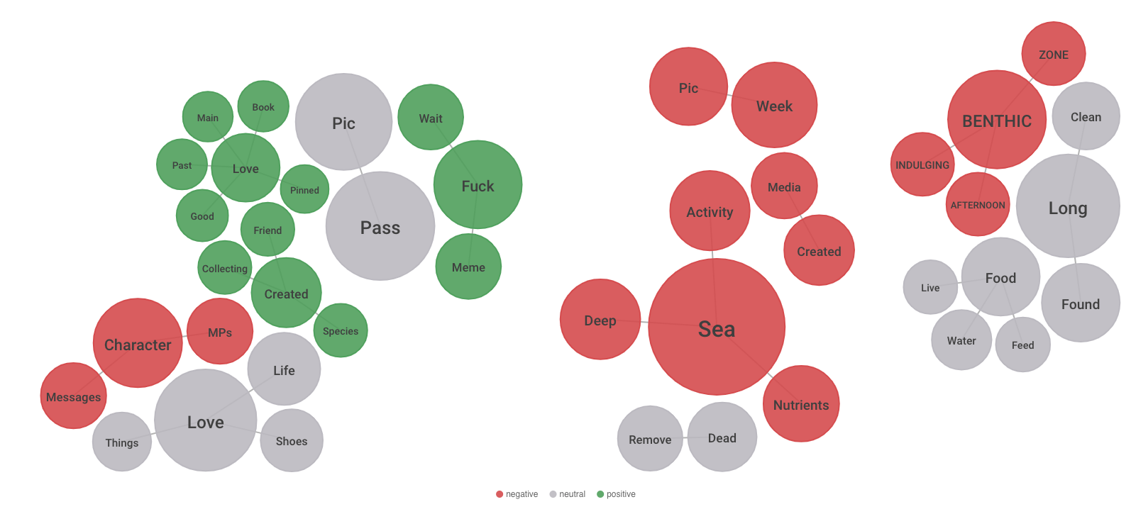 And just because I love these bubble charts, here’s a sentiment chart of the primary keywords, grouped by context, from the investigation.